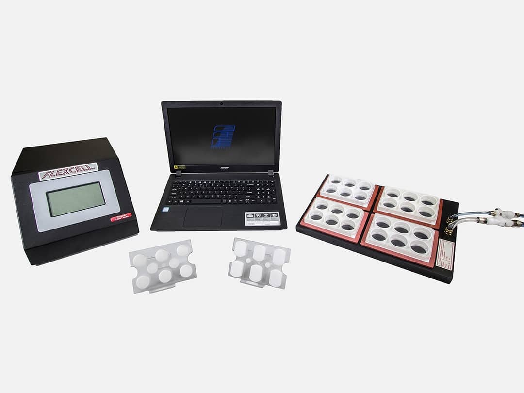The FX-5000™ Compression System is a patented, computerized, pressure-operated instrument that applies a defined controlled, static or variable duration cyclic compression, to cells growing in vitro. This system utilizes regulated air pressure to deflect flexible-bottomed BioPress culture plates compressing a tissue sample or 3D cell culture between a piston and a stationary platen. This system can apply up to 14 pounds of applied force.