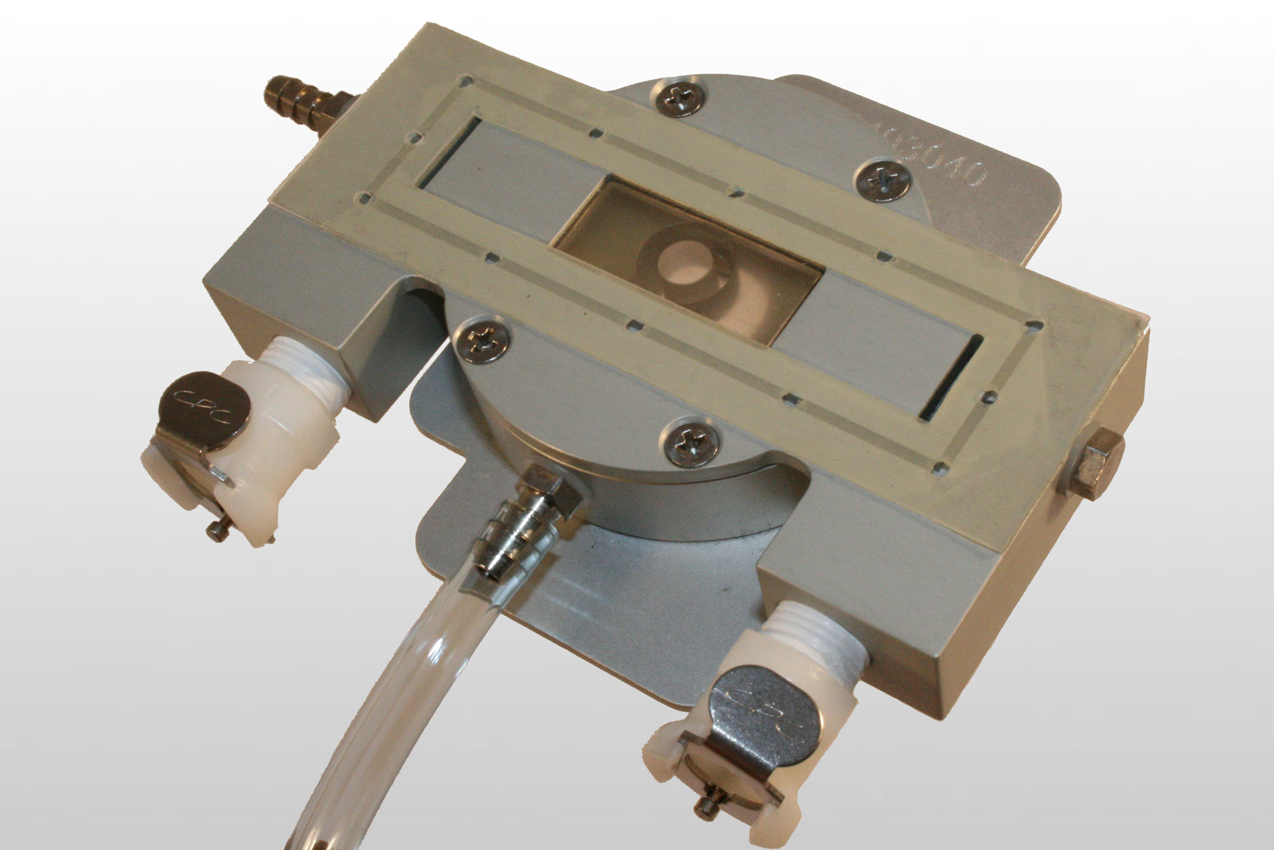 The FlexFlow is a parallel plate laminar flow device designed to apply fluid shear stress and/or cyclic strain to cells in culture while providing a means for viewing cell activity under a microscope in real time. The FlexFlow fits on the stage of a standard upright microscope.