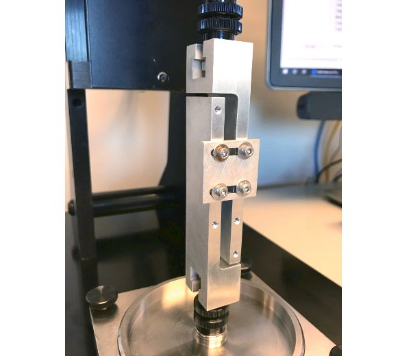 測試膠粘劑的質(zhì)量時,測試膠粘劑沿粘合界面的抗剪切力的重要性能。 在這種情況下,重要的是小化層之間的剝離,這可能會大大降低粘結(jié)的耐搭接剪切強度。 基于專為在硬質(zhì)塑料和金屬部件中實現(xiàn)牢固粘合而設(shè)計的夾具,這些夾具已針對測試生物材料或組織之間的粘合特性進行了化。 它帶有一個te殊的固定器,該固定器旨在促進直接注入兩個壓板之間的水凝膠的原位制備,以大程度地減少暴露于空氣中。 在水凝膠的情況下,還可以測量凝膠的剪切強度及其與壓板材料的粘附性。