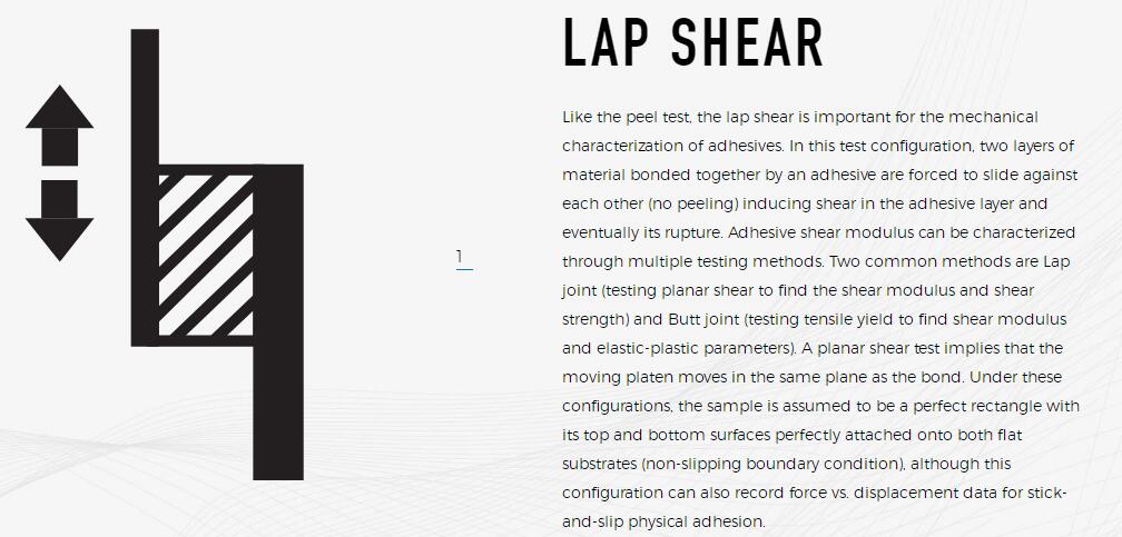 通過粘合劑粘合在一起的兩層材料被迫彼此滑動(wu剝離),從而在粘合劑層中引起剪切,并終使其破裂。 粘合剪切模量可以通過多種測試方法進行表征。 兩種常見的方法是搭接(測試平面剪切以找到剪切模量和剪切強度)和對接(測試拉伸屈服以找到剪切模量和彈塑性參數(shù))。 平面剪切測試意味著移動的壓板在與粘結(jié)相同的平面中移動。 在這些配置下,樣品被假定為一個完美的矩形,其頂部和底部表面完美地附著在兩個平坦的基板上(防滑邊界條件),盡管此配置也可以記錄粘滑的力與位移數(shù)據(jù) 物理粘附。