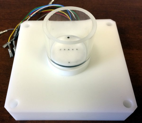 該腔室設(shè)計(jì)用于在機(jī)電活性材料(例如結(jié)締組織,帶電水凝膠等)壓縮期間同步測(cè)量電勢(shì)分布。 該腔室具有5個(gè)差分Ag-AgCl電極通道和一個(gè)較大的參比電極。 圓形電極直徑為1毫米,它們之間(中心到中心)的距離為4毫米。 可根據(jù)要求提供定制的幾何形狀。 腔室可以充滿PBS溶液。