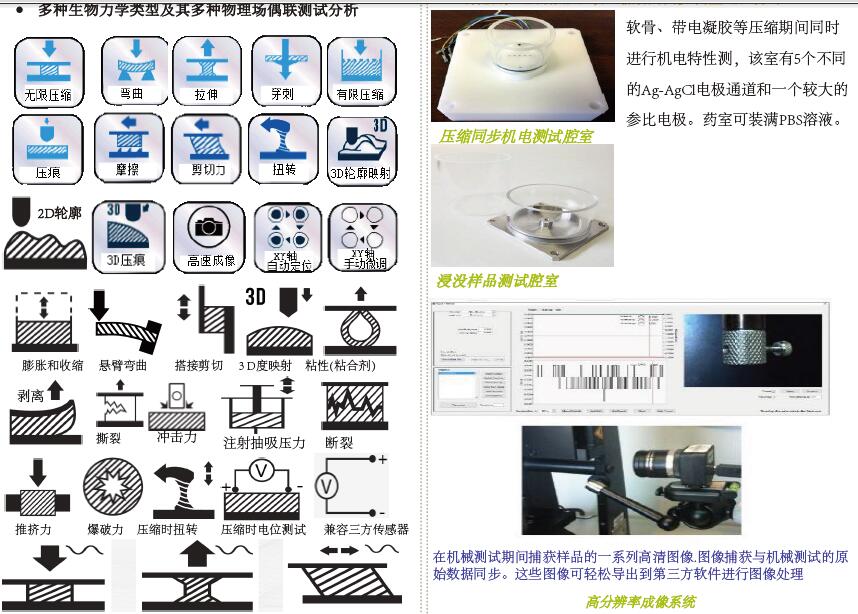 該BMM 材料/組織機(jī)電耦合效應(yīng)特性測(cè)試儀(機(jī)械力偶聯(lián)電位測(cè)試分析),可帶電活性組織或材料進(jìn)行機(jī)械力偶聯(lián)電位測(cè)試分析,比如關(guān)節(jié)軟骨、帶電水凝膠等活組織壓縮期間同步進(jìn)行電位測(cè)試,可集成3D輪廓表面形貌表征、拉伸、壓縮、三彎曲、四點(diǎn)彎曲、扭力、剪切、摩擦磨損、電特性等各種力電多物理場(chǎng)測(cè)試。 能對(duì)極軟、極硬組織材料進(jìn)行精密可靠的機(jī)械刺激和表征。允許表征的機(jī)械性能包括剛度、強(qiáng)度、模量、粘彈性、塑性、硬度、附著力、腫脹和松弛位移控制運(yùn)動(dòng)各種機(jī)械特性