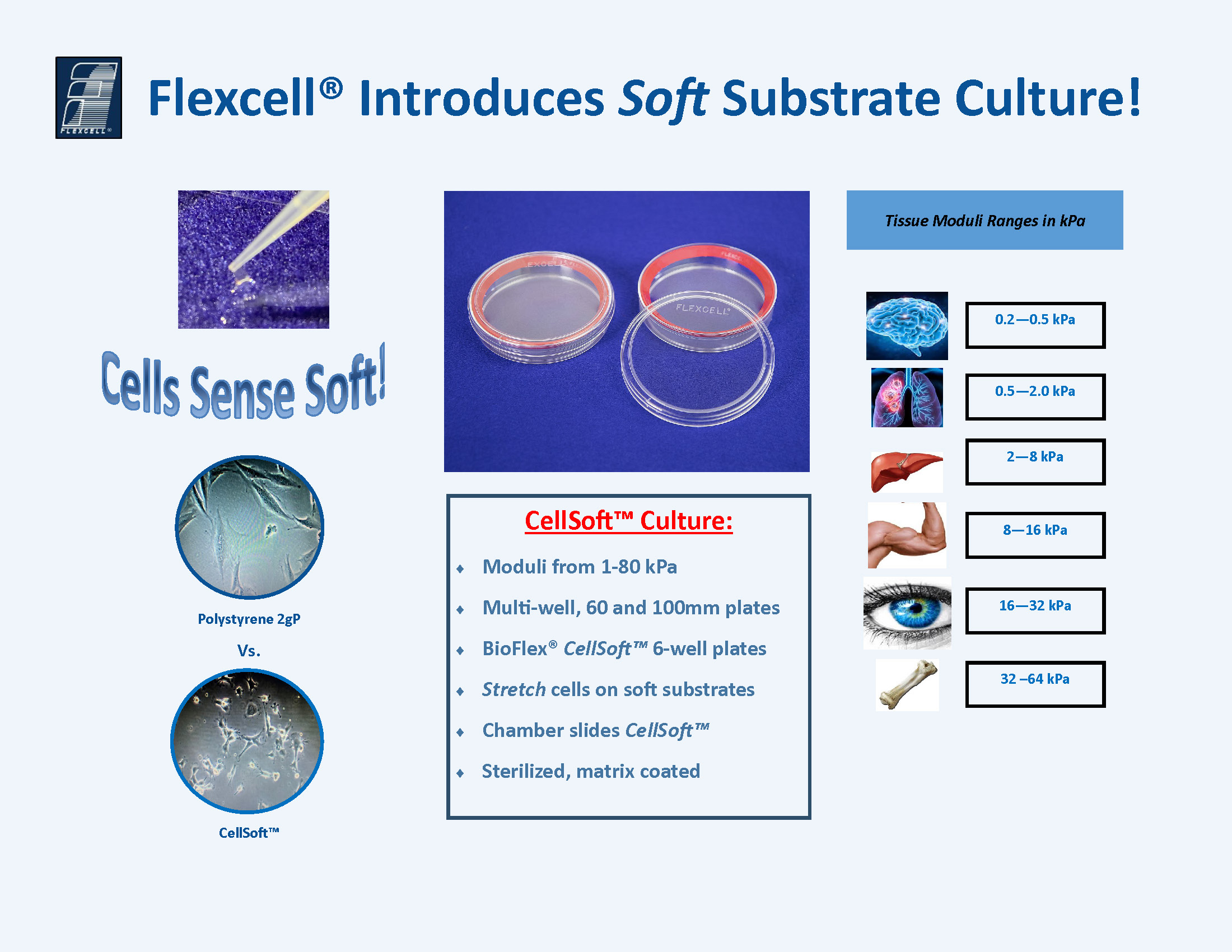 “Cells like soft!” says flexercell® Founder and President, Dr. Albert Banes, Ph.D. “Cell culture has met with change over the years, but two of the hottest innovations have been the ability to grow and stretch cells on flexible growth surfaces and to control the rigidity of the substrate. Our new CellSoft™ culture ware advances those innovations even further, and we know researchers will appreciate this product.”