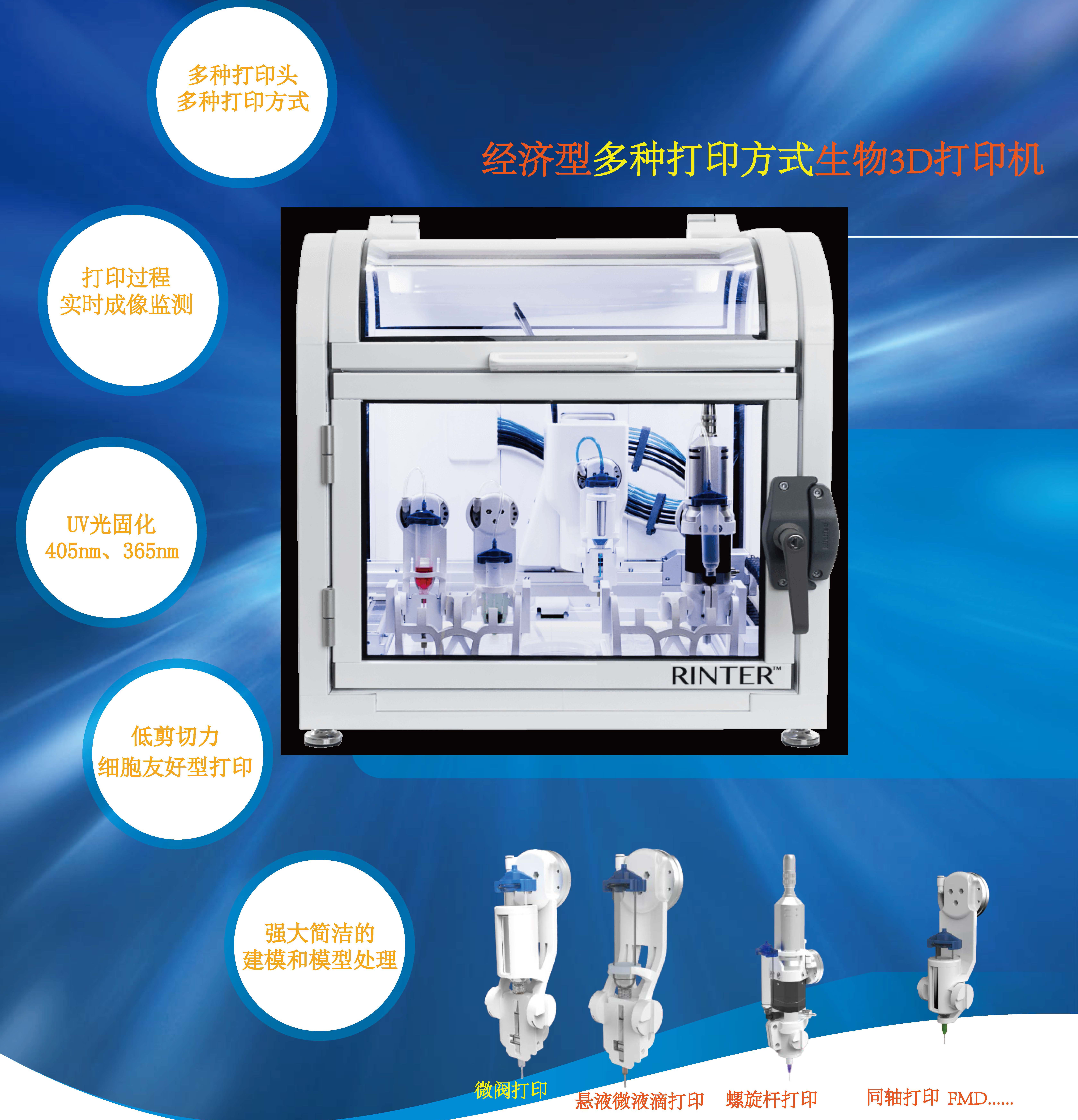 ——在單個打印平臺上提供可變多種的打印方式(注射擠出打印頭、細胞友好型微閥打印頭、微液滴懸液打印頭、螺旋擠出打印頭等),經(jīng)濟的價格,高端打印機的性能