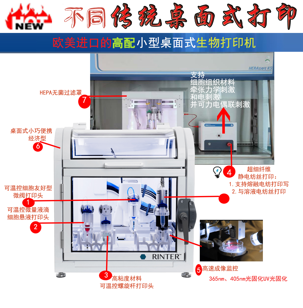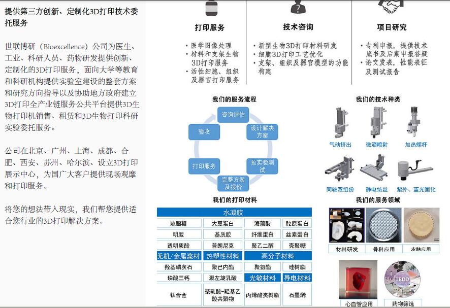 世聯(lián)博研北京科技公司聯(lián)合歐美國際前沿廠家推出了一系列靈巧實惠型的集成微閥細(xì)胞噴射打印頭、微量懸液打印頭、熔融靜電紡絲打印頭、溶液靜電紡絲打印頭以及同軸打印頭、螺旋桿擠出打印頭等各式打印技術(shù)打印頭以及 UV LED固化頭等各種打印技術(shù)和打印頭的小型桌面式3D生物打印機(jī)。以實用的功能、低廉的購置成本以及簡便的操作把高端3D生物打印技術(shù)送進(jìn)每一個實驗室!