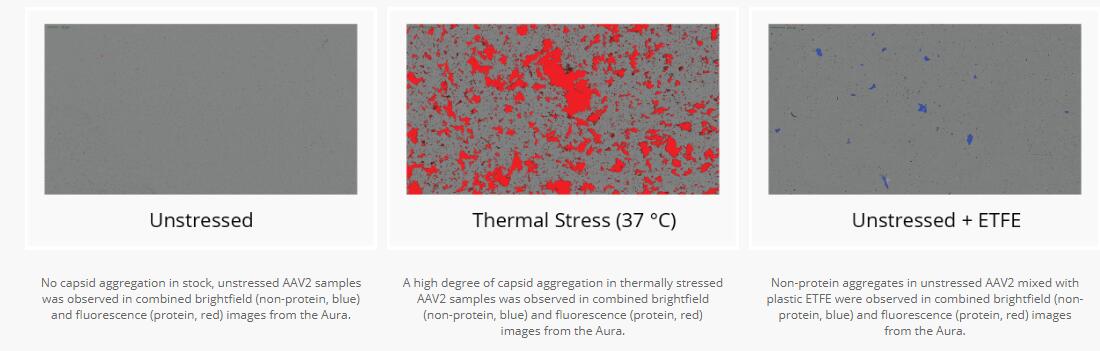 在來自Aura的組合明場(非蛋白質(zhì),藍(lán)色)和熒光(蛋白質(zhì),紅色)圖像中,未受應(yīng)力的AAV2樣品的庫存中沒有衣殼聚集現(xiàn)象。