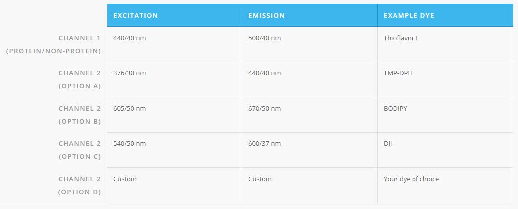 獲得確定配方中其他顆粒所需的靈活性。 在TMA,Bodipy,DiI的通道之間進(jìn)行選擇,以識別疏水性實體或特定于您的過程的其他分子。 看不到您想要的頻道嗎? 選擇您自己的自定義激發(fā)和發(fā)射!