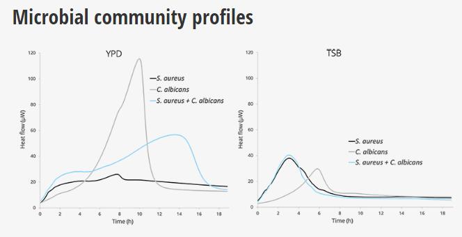 混合培養(yǎng)物的熱流曲線可以根據(jù)培養(yǎng)基選擇和不同生物的相互作用而變化。 可以計(jì)算出微生物群落的累積能量釋放,并且可以輕松得出混合培養(yǎng)物與單個生物的代謝曲線之間的比較。