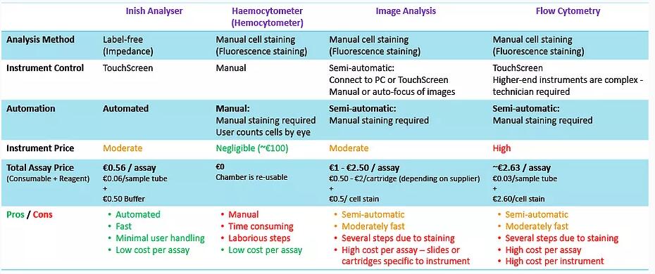 下表比較了使用阻抗譜的 Cellix Inish Analyzer; 到常用的細(xì)胞計(jì)數(shù)和活力方法,這些方法都使用細(xì)胞染色: