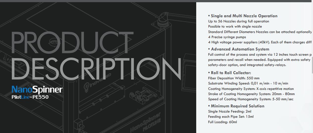 PE-550是我們zui暢銷的用于連續(xù)生產(chǎn)納米纖維的靜電紡絲設(shè)備,適用于工業(yè)規(guī)模的納米纖維生產(chǎn)。它的主要優(yōu)勢(shì)是可擴(kuò)展性,因?yàn)樗m用于生產(chǎn)線以及R&D項(xiàng)目。PE-550配有56個(gè)噴嘴,可實(shí)現(xiàn)大規(guī)模生產(chǎn)納米纖維的高生產(chǎn)率,但在R&D項(xiàng)目中,它也可配有1個(gè)噴嘴。