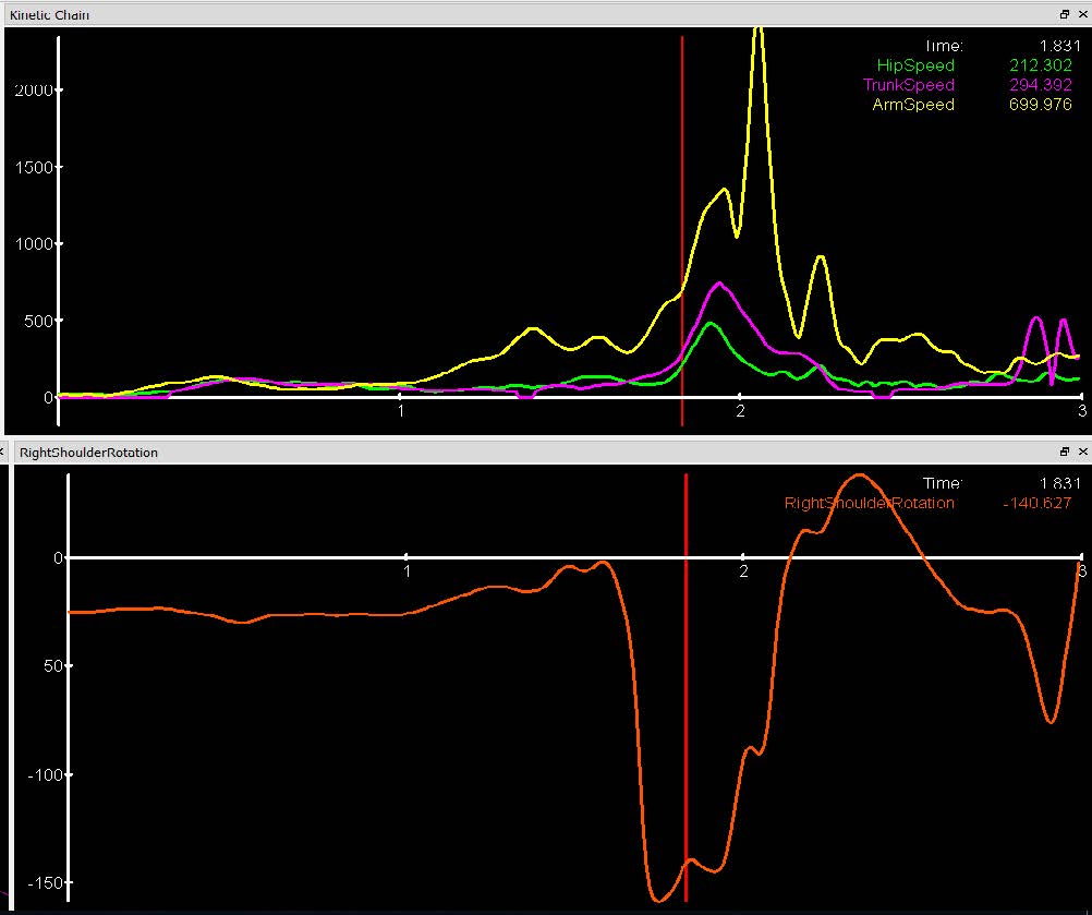 分析關鍵的投擲指標,例如生物力學對齊; 骨盆、軀干、肩部和肘部的旋轉和加速度。